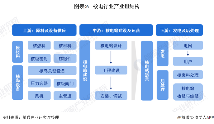 核電是我國能源供應體系的重要分支,也是新能源的重要組成部分。核電產業的上游包括核電設備、核燃料核材料的供應等;中游包括核電站的建設、運營;下游主要涉及發電、維修和后處理市場。