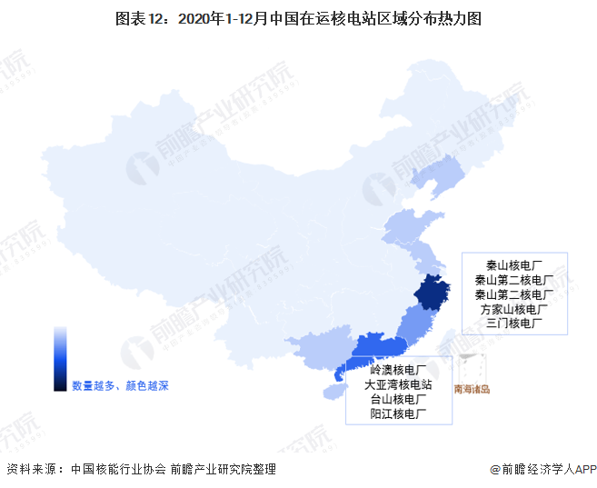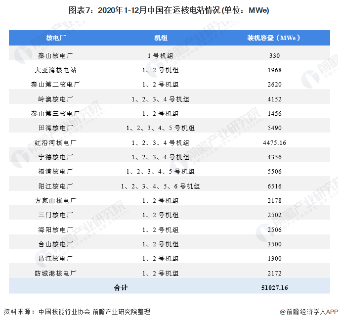 截至2020年末,中國共有16座核電站投入運行,運行核電機組達49臺。其中,裝機容量排名前三的是陽江核電廠、福清核電廠、田灣核電廠。