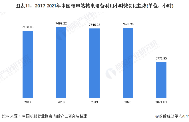 從核電設備利用小時數變化趨勢來看,2017-2020年,利用小時數均在7000小時以上,并呈總體提升趨勢。2021年上半年,核電設備利用小時數為3771.95小時。