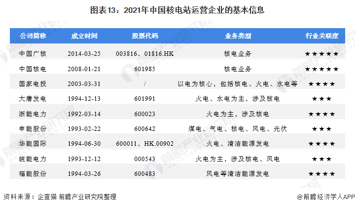 目前,我國核電行業-核電站運營企業的數量不多,因存在嚴格的行政準入門檻、資金門檻和技術門檻等,主要公司包括:中國廣核、中國核電、國家電投大唐發電等。