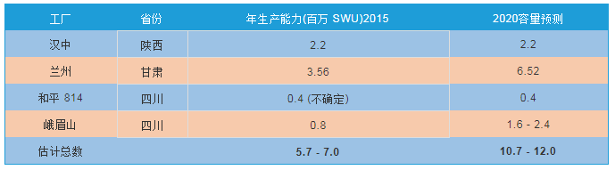 2012-14年間,漢中的一個北部擴建項目建成,采用中國本土技術,年產(chǎn)能120萬SWU。