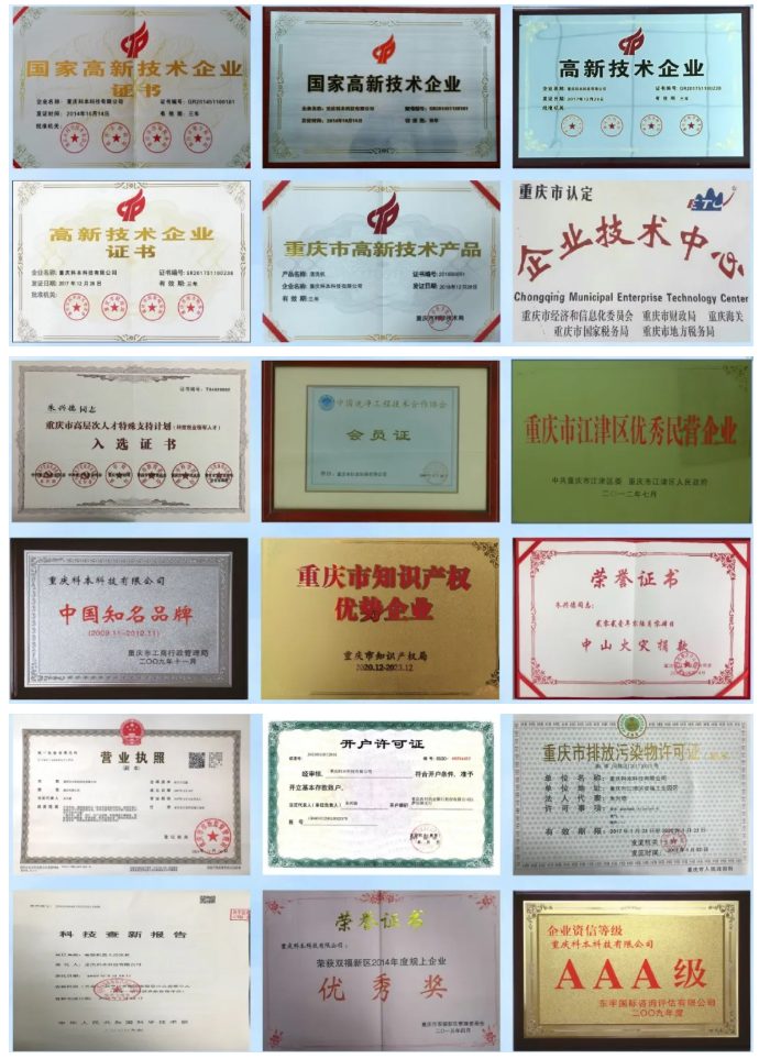 公司先后榮獲中核集團合格供應商、2014年國家高新技術企業證書、2014年國家高新技術企業、2017年高新技術企業、2017年高新技術企業證書、2018年重慶市高新技術產品、重慶市認定企業技術中心、2012年重慶市江津區優秀民營企業、2009年中國知名品牌、2020-2023重慶市知識產權優勢企業、中山火災捐款榮譽證書、2009年企業資信AAA級企業等多項資質和榮譽,成為重慶名牌企業。