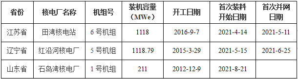 表1:2021年1-9月首次裝料的核電機(jī)組信息