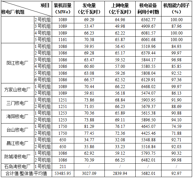 2) 本表最后一行“合計(jì)值/整體值/平均值”中,裝機(jī)容量、發(fā)電量、上網(wǎng)電量為各機(jī)組合計(jì)值,核電設(shè)備利用小時(shí)數(shù)為全部機(jī)組整體值,能力因子為全部機(jī)組的算數(shù)平均值。