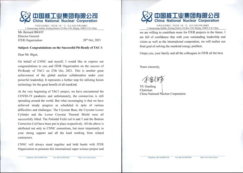 中核集團董事長余劍鋒與ITER組織總干事Bigot互致賀信。