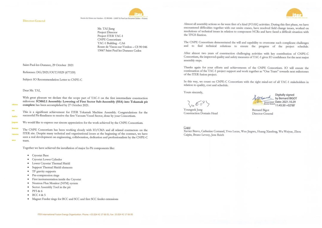 ITER組織總干事Bigot向中核集團聯合體團隊致以衷心的祝賀和感謝: