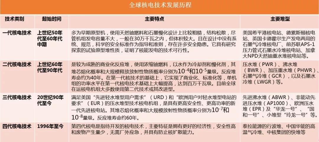 同時,60余年間,核電技術(shù)也經(jīng)歷了從一代原型堆到二代商業(yè)化反應(yīng)堆,再到三代先進(jìn)大功率核反應(yīng)堆的迭代升級,以及對安全性、經(jīng)濟(jì)性更高的四代核電技術(shù)的探索和實踐。