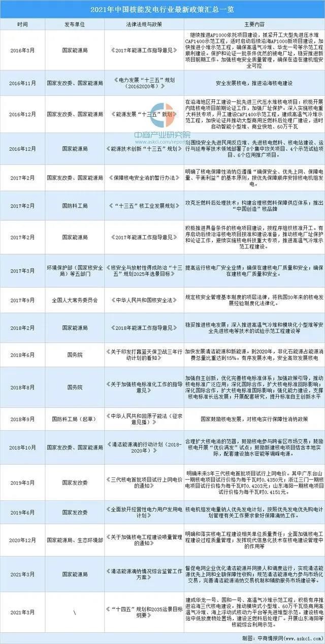 9月22日,中共中央、國務院印發的《關于完整準確全面貫徹新發展理念做好碳達峰碳中和工作的意見》發布。其中關于核電方面,《意見》明確提出積極安全有序發展核電、積極穩妥推進核電余熱供暖。以下是2016-2021核能發電行業最新政策匯總一覽: