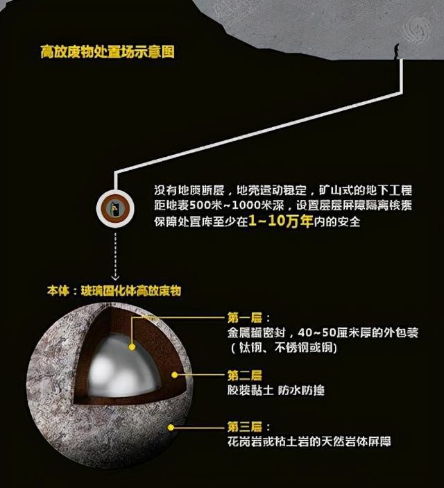 此外,我國在核廢料處理采用了國際核廢料處理七大解決方案中的深地質處理法,即將高放射性核廢料制成玻璃化的固體,然后被裝入可屏蔽輻射的金屬罐中,最后人們將這些金屬罐放入位于地下500—1000米的處置庫內。