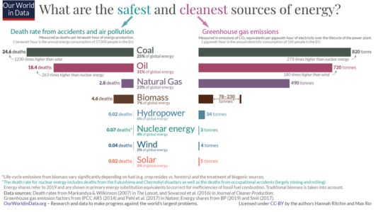 與化石燃料,甚至一些可再生能源相比,核能生產造成的死亡人數最少,產生的溫室氣體數量也很少。