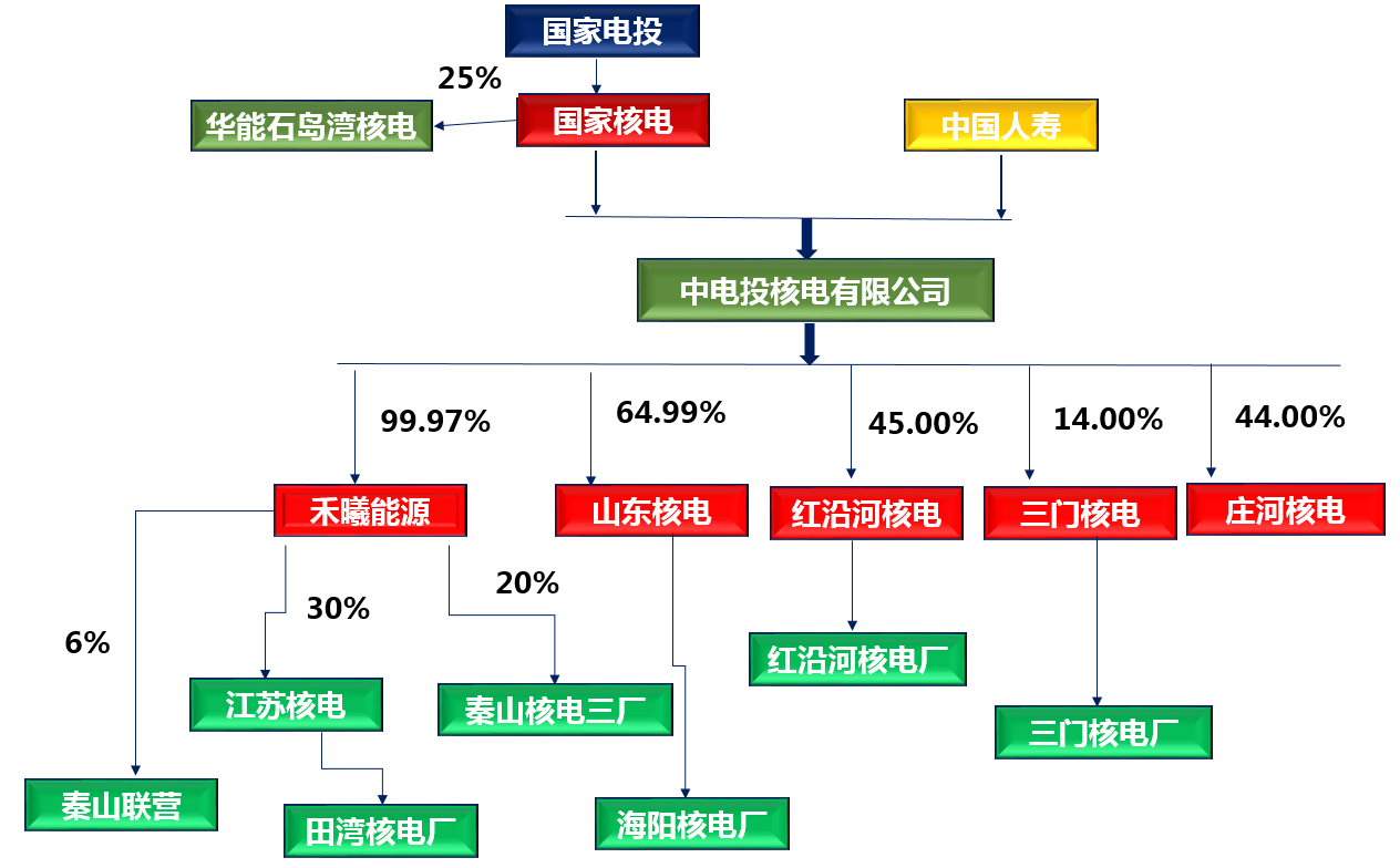 據查詢,國家電投100%控股上海禾曦能源投資有限公司(簡稱“禾曦能源”),通過后者分別持有第三秦山核電有限公司(簡稱“秦山核電三廠”)、江蘇核電有限公司(簡稱“江蘇核電”)和核電秦山聯營有限公司(簡稱“秦山聯營”)20%、30%和6%股權,擁有秦山核電三廠、田灣核電廠和秦山核電二廠裝機權益。