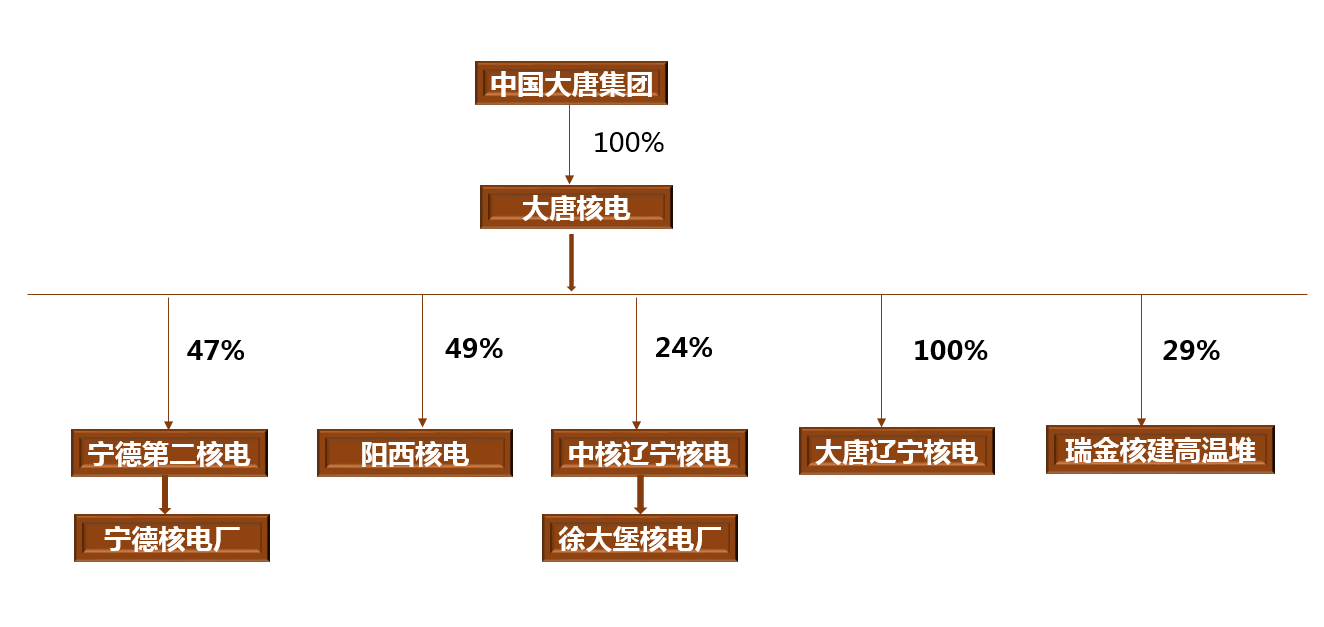 中國大唐集團進軍核電的主體是中國大唐核電有限公司(簡稱“大唐核電”),其分別持有福建寧德第二核電有限公司(簡稱“寧德第二核電”)、陽西核電有限公司(簡稱“陽西核電”)、中核遼寧核電有限公司(簡稱“中核遼寧核電”)47%、49%和24%股權,擁有寧德核電廠、陽江核電廠和徐大堡核電廠的裝機權益。