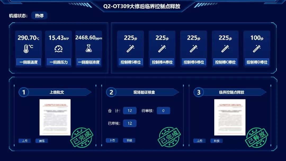 11月24日08:35,秦山核電3號機組主控室7樓會議室現場,華東監督站通過秦山核電數字化臨界釋放系統對309大修臨界控制點進行了線上數字化釋放。本次臨界釋放是國內核電首次采用線上數字化的方式進行的臨界控制點核查釋放,對核電大修數字化轉型升級具有重要意義。
