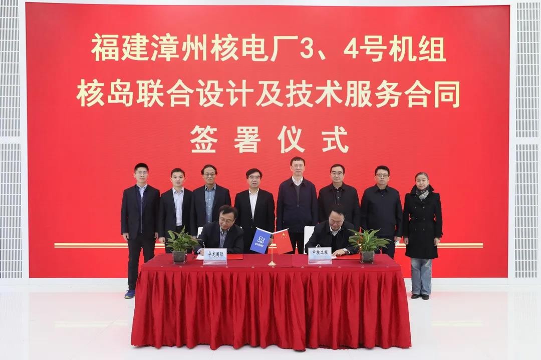 12月15日,在華龍國際核電技術有限公司黨委書記、總經理高立本,中核國電漳州能源有限公司總經理宋豐偉,中國核電工程有限公司總經理、黨委副書記荊春寧等領導的見證下,華龍國際副總經理信天民、漳州能源副總經理蔣祖躍、中核工程副總經理陳學營、中國核動力研究設計院副院長唐傳寶共同簽署了《福建漳州核電廠3、4號機組核島聯合設計及技術服務合同》。