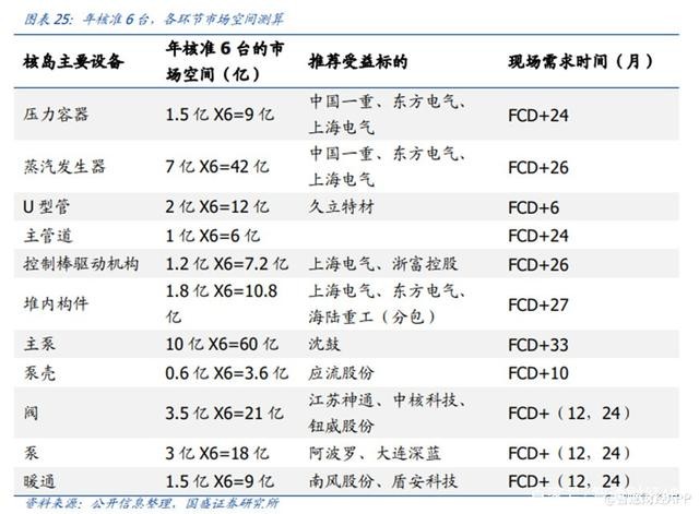 另外,根據十四五規劃及中國核能行業協會的預測,十四五期間我國核電年均新增核準約6GW(5~6臺)。按目前核電單臺機組200億/臺的投資額,若每年核準6臺將帶來1200億元/年的市場空間。同時CAP1400的國內核準有望啟動CAP1400的出海工作。根據中國電力報預計,在“一帶一路”上及其周邊有多個國家已經和正在計劃發展核電,到2030年新建機組預計將達到107臺。如果我國能夠獲得“一帶一路”沿線30%的市場份額,即約30臺海外市場機組。每出口一臺核電機組,需要8萬余臺套設備,200余家企業參與制造和建設,以單臺機組投資約200億元測算,30臺機組將直接產生近6000億產值。