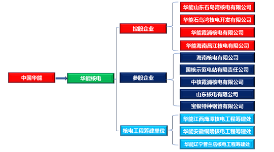 目前,中國華能旗下華能核電控股4家核電子公司,參股5家核電企業,另設3個核電工程籌建單位,形成了較為完整的核電站建設、開發和運營體系。