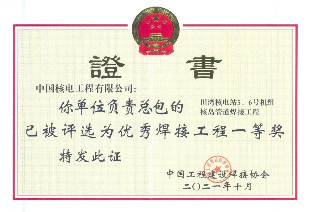 自2018年以來,中核工程公司總承包的田灣核電二期擴建工程---田灣核電站3號機組核島安裝安全系統(tǒng)焊接工程榮獲2018年全國優(yōu)秀焊接工程;總承包的田灣核電二期擴建工程---田灣核電站3號機組主管道焊接工程榮獲2019年全國焊接工程一等獎; 田灣核電站3號核島鋼結構工程榮獲2019年全國焊接工程優(yōu)秀焊接工程一等獎;總承包的田灣核電二期擴建工程---田灣核電站4號機組主管道焊接工程榮獲2020年全國優(yōu)秀焊接工程一等獎; 總承包的田灣核電站5、6號機組核島管道焊接工程榮獲2021年全國優(yōu)秀焊接工程一等獎。