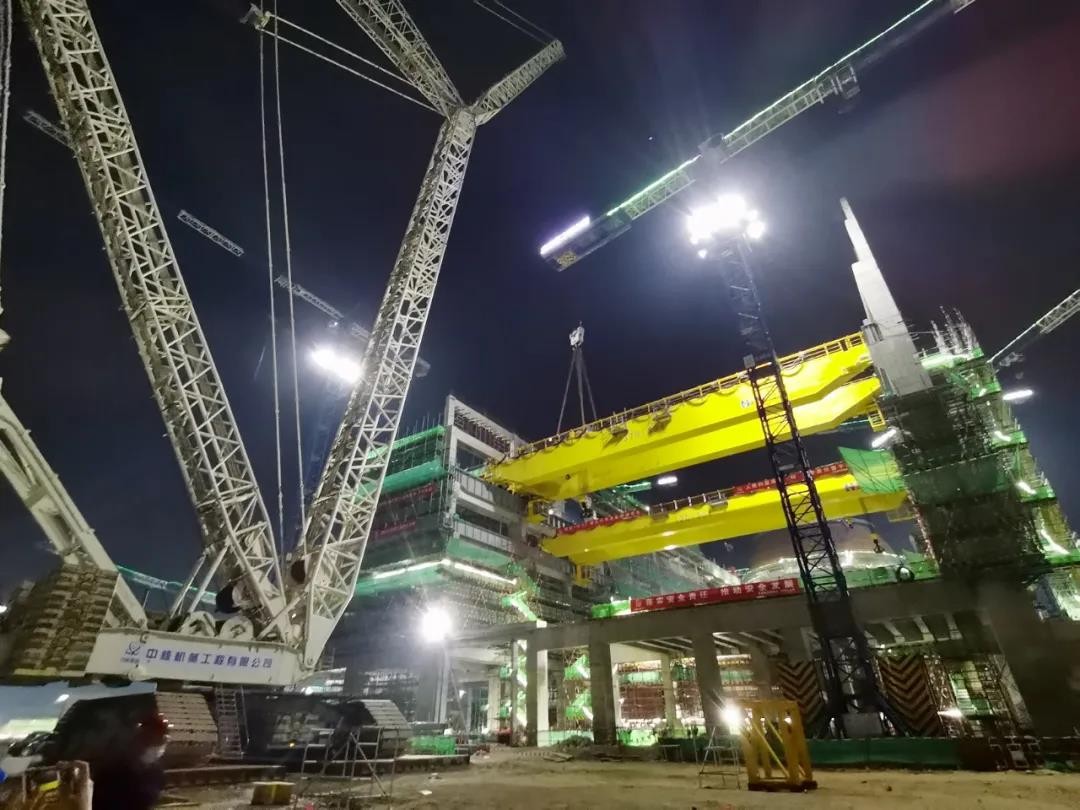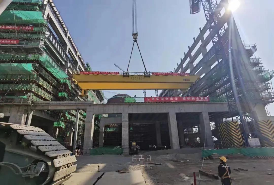 兩臺主行車使用1600噸級履帶吊開展本次吊裝任務,總共分7鉤吊裝,歷時兩天,經過吊車的起鉤、變幅、回轉和落鉤等過程,最后就位于軌道上,整個吊裝過程平穩有序。主行車的順利吊裝為后續常規島主廠房的汽輪機、發電機、凝汽器、汽水分離再熱器等設備引入安裝創造了先決條件,標志著漳州核電2021年大件吊裝工作完美收官。