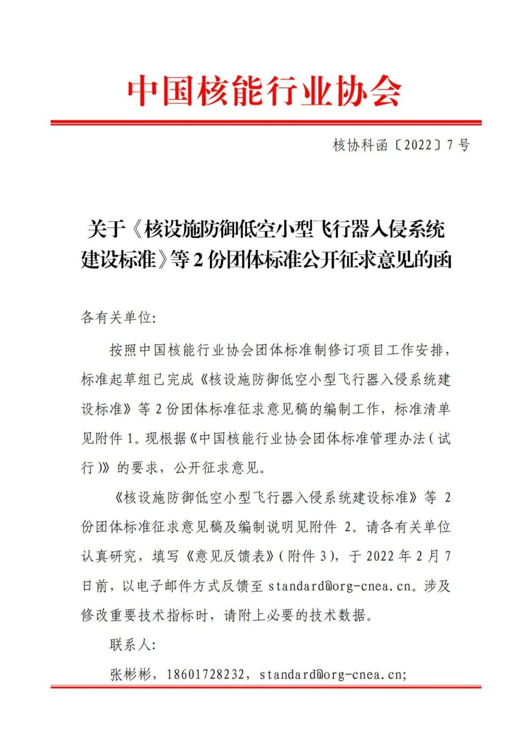 關于《核設施防御低空小型飛行器入侵系統建設標準》等2份團體標準公開征求意見的函