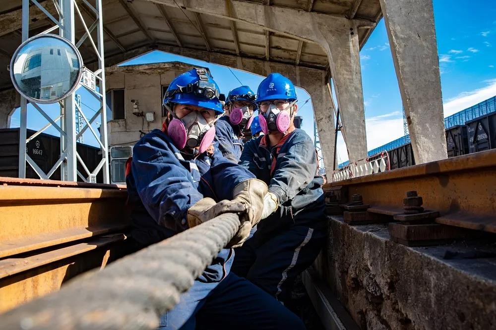 ▲內(nèi)蒙古公司通遼發(fā)電總廠職工在狹窄的地溝里,正在對卸儲煤系統(tǒng)翻車機重車鐵牛鋼絲繩進行檢修