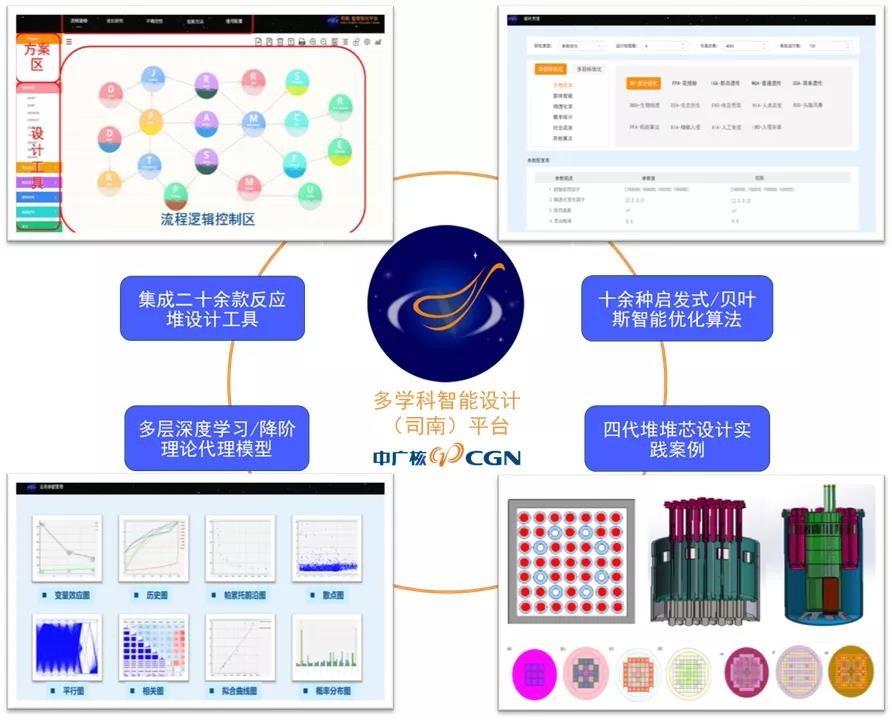 由中廣核研究院自主研發的多學科智能設計(司南)平臺,已集成二十余款核設計軟件,開發十余種啟發式/貝葉斯智能算法,研制多層深度學習/降階理論代理模型,在先進堆型堆芯設計、屏蔽優化與安全分析等領域實踐,實現跨專業定制化方案探索效率的大幅提升,創新性解決了有限資源約束下多目標智能設計的難題。