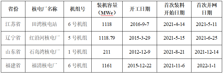 ▼表1:2021年1-12月首次裝料的核電機(jī)組信息