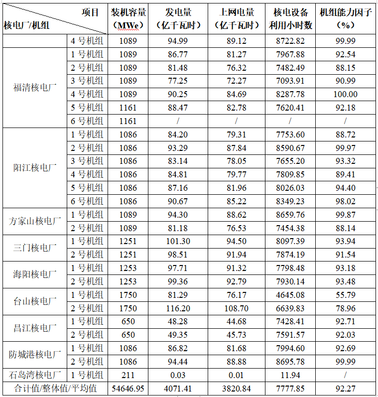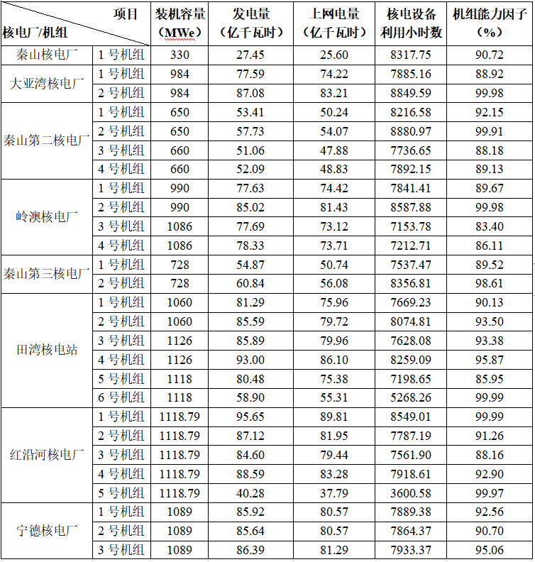 3)本表最后一行“合計(jì)值/整體值/平均值”中,裝機(jī)容量、發(fā)電量、上網(wǎng)電量為各機(jī)組合計(jì)值,核電設(shè)備利用小時(shí)數(shù)為全部機(jī)組整體值,機(jī)組能力因子為全部機(jī)組的算數(shù)平均值。