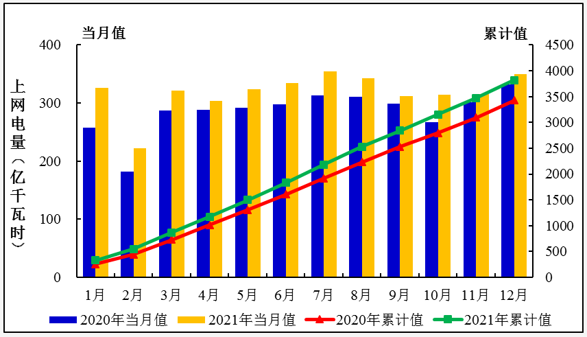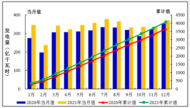 圖3:2020、2021年1-12月全國(guó)運(yùn)行核電機(jī)組上網(wǎng)電量趨勢(shì)