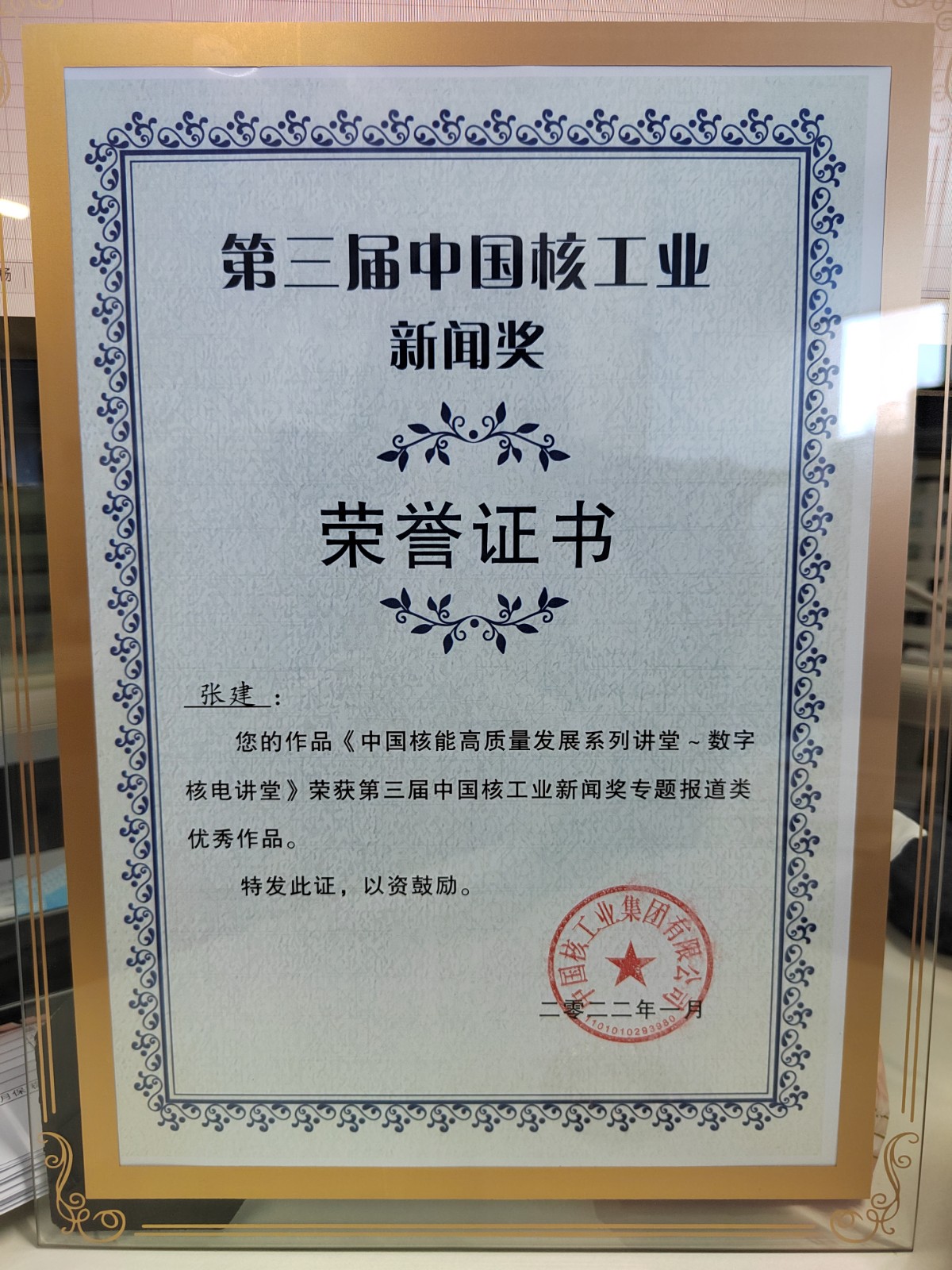 2022年1月15日,中核集團公布第三屆中國核工業新聞獎,中國核電網主編張建參與策劃和執行的“中國核能高質量發展系列講堂——數字核電講堂”欄目榮獲第三屆中國核工業新聞獎專題報道類優秀作品。