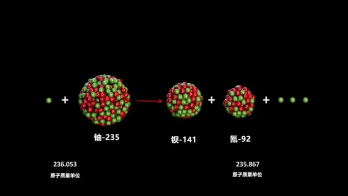 這種能量是從哪里來的?如果我們考慮鈾-235和入射中子的質量之和,我們會得到236.053個原子質量單位。然后我們把反應后的產物的質量加起來,只會得到235.867個原子質量單位,前后相差了0.186個原子質量單位。根據愛因斯坦質能方程,前后質量之差轉化為了1.73億電子伏特的能量。