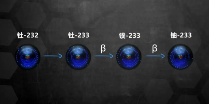 在這個反應堆中,天然存在的釷-232吸收了一個中子變成釷-233。然而,這種同位素并不是很穩定,它會經歷β衰變成為鏷-233。同樣,這種同位素也是不穩定的,它將再次經歷β衰變成為鈾-233。我們從釷開始,繞了一圈又回到了鈾。但與傳統鈾核電站不同的是,生成的鈾都是可裂變的,沒有鈾-238的問題。最終,釷將全部轉化為鈾-233作為燃料消耗殆盡,也不大會產生相對危險的放射性廢物。