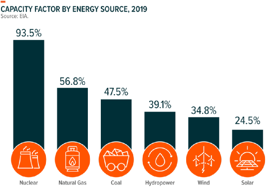 太陽能和風能等可再生能源依賴于多變的氣候條件為其面板和渦輪機提供動力,而且在一天和一年中的許多時間點可能根本不會產生太多能量。間歇性停電使他們難以作為國家電力需求的唯一提供者。相反,美國能源信息署 (EIA) 報告稱,核能在93.5%的時間內滿負荷運行,使其成為迄今為止最可靠的能源。