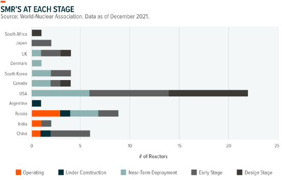 世界上第一個SMR是一艘位于北極的浮動駁船,為俄羅斯佩韋克鎮提供動力。它提供了如何使用SMR技術的案例,特別是在依賴化石燃料的農村地區。目前,在17個國家有70多種處于不同發展階段的SMR設計。