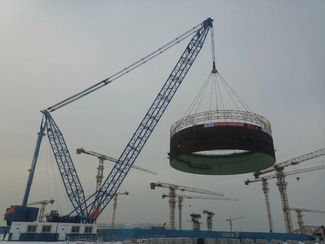 春節假期剛結束,徐大堡核電廠就迎來了重大施工活動——將半徑22米、總重約102噸的核島安全殼鋼襯里筒體模塊利用重型吊車從島外拼裝現場一次性吊裝到核島混凝土基礎上。監督員結合吊裝施工計劃和吊裝專項方案,有針對性地開展了吊裝前的各項準備情況檢查,包括鋼襯里模塊拼裝完成情況、吊裝方案準備情況、環形吊具組裝試吊情況、安全質量措施落實情況等。認真核查了鋼襯里模塊承壓區域混凝土強度情況,在施工現場見證了混凝土強度測試試驗。鋼襯里模塊于2022年2月18日上午5點58分起吊,歷經起吊、提升、變幅、再提升、轉臂、下降等步驟,耗時三個多小時,最終于上午9點50分順利完成了吊裝就位等工作。