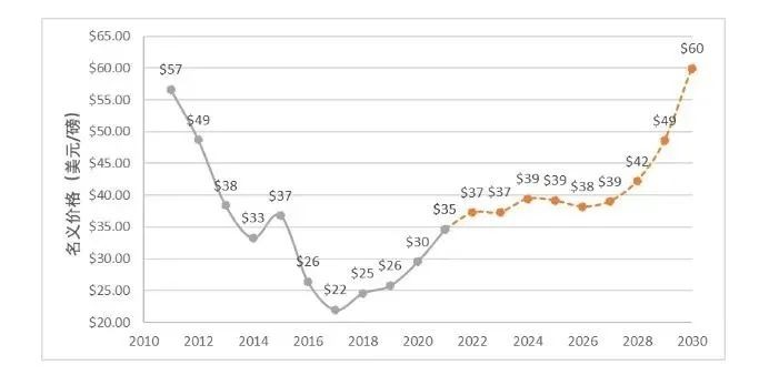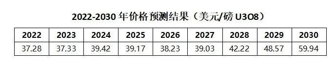 報告還對2022-2030年天然鈾現貨價格作了預測。之所以選擇對長期現貨價格進行預測,是因為該價格是反應市場供需關系的主要指標,是長貿協議引用的重要指數,且不易受到短期市場投機行為的影響。
