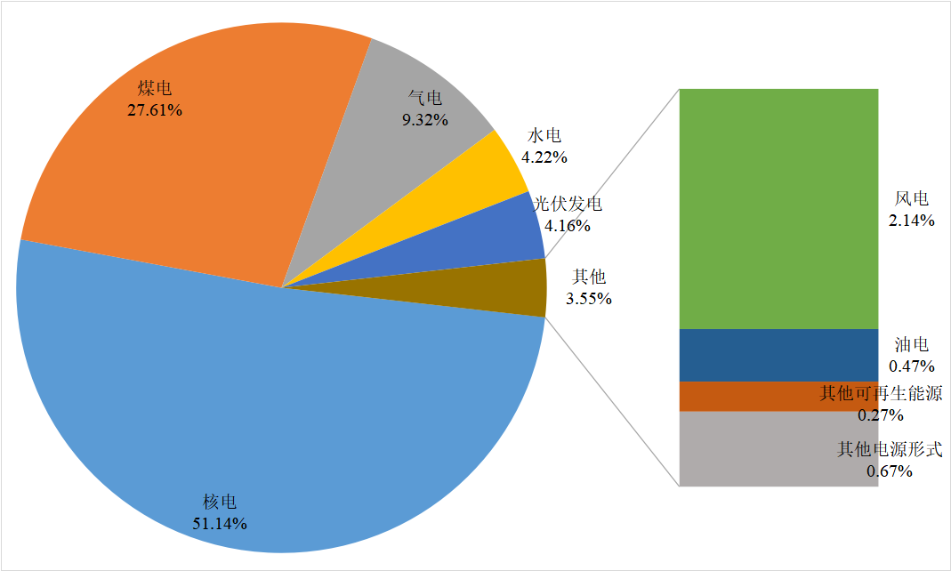 2020年,烏克蘭核電在國家電力結(jié)構(gòu)中占比為51.14%,僅次于法國和斯洛伐克,位居世界第三位。2020年,烏克蘭總發(fā)電量為1490億千瓦時,分電源形式看,核電發(fā)電量為762億千瓦時,煤電為412億千瓦時,氣電為139億千瓦時,水電為63億千瓦時,光伏發(fā)電為62億千瓦時,風(fēng)電為32億千瓦時,其他可再生能源為4億千瓦時,油電為7億千瓦時,其他電源形式為10億瓦時,人均年發(fā)電量為3420千瓦時。2020年,烏克蘭全社會用電量為1464億千瓦時,人均全社會年用電量3358千瓦時,同比我國人均全社會年用電量5320千瓦時。