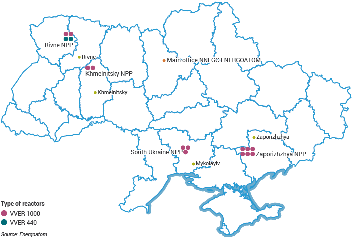 烏克蘭核電機(jī)組分布在赫梅利尼茨基、羅夫諾、南烏克蘭和扎波羅熱等4座核電站,全部采用VVER壓水堆技術(shù),除羅夫諾核電站1、2號機(jī)組采用VVER-440技術(shù)外,其他13臺機(jī)組全部采用VVER-1000技術(shù)。扎波羅熱核電站在運機(jī)組6臺,總裝機(jī)容量600萬千瓦,是歐洲在運機(jī)組數(shù)量最多和裝機(jī)容量最大的核電站。