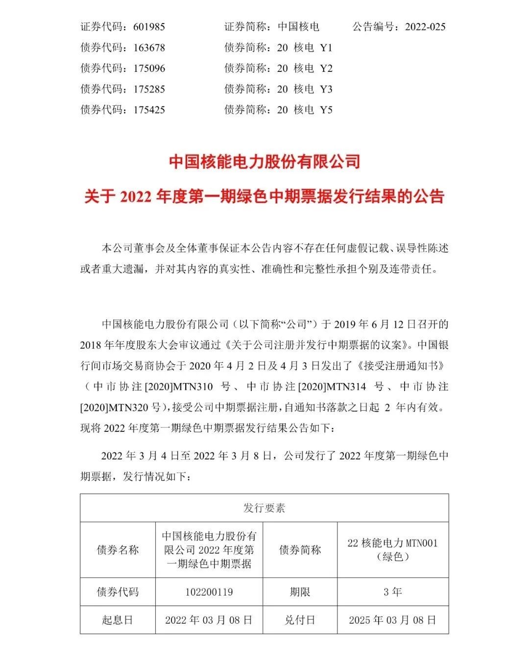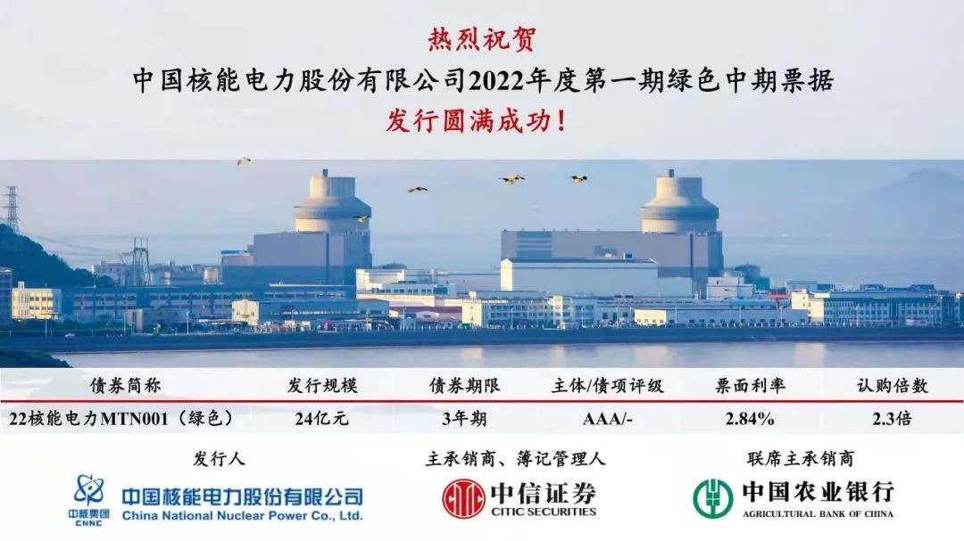 中國核能電力股份有限公司2022年度第一期綠色中期票據發行圓滿成功!