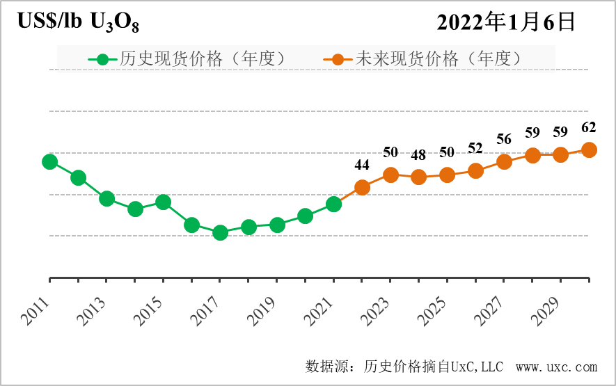 供應方面,受金融機構的操作,鈾價短期內大幅震蕩,以42美元/lbU3O8結束2021年,相較年初的30美元/lbU3O8提高了10美元以上,這為潛在的鈾產量增長提供舒適段位,哈薩克斯坦的Zhalpak和Budenovskoye 6/7低成本項目將相繼于2022年和2024年投產。