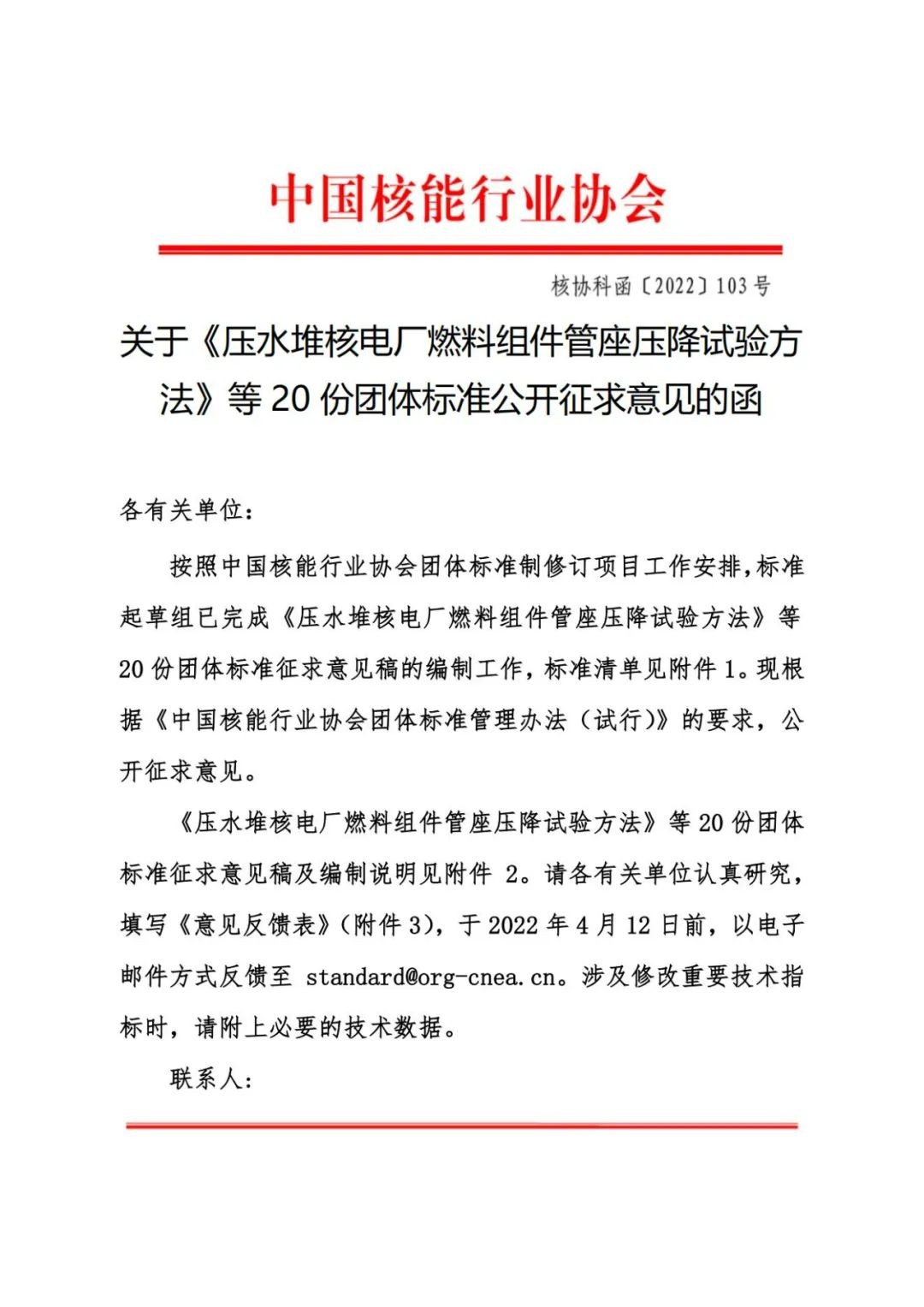 關于《壓水堆核電廠燃料組件管座壓降試驗方法》等20份團體標準公開征求意見的函