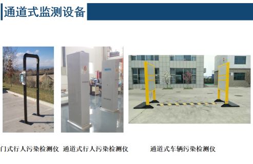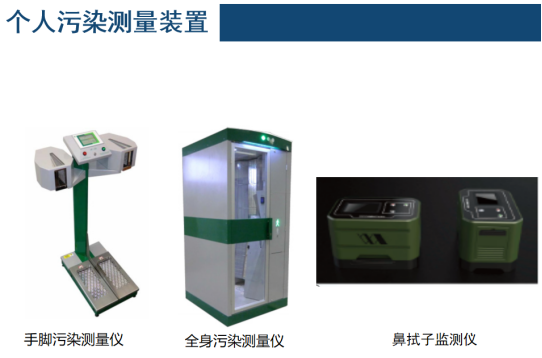• 個人監測 目的是控制應急響應人員的照射和污染,監測來自事故區域人員的皮膚和衣物的污染,監測放射性碘的攝入情況,個人監測儀器主要包括各類個人劑量計、便攜式表面污染儀、甲狀腺計數器等,另外門式人員污染監測儀可滿足大量人群的快速監測需要。