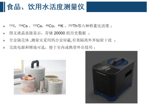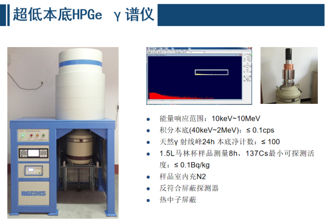 • 實驗室樣品分析測量設備 當直接測量法受現場條件制約難于進行或其靈敏度難于滿足測量要求時,通常采用取樣、處理、測量的實驗室分析方法,應特別關注樣品的代表性和樣品處理方法可能對測量結果產生的影響。介質一般包括擦拭樣、空氣、水及水生物、土壤及沉積物、動植物及其產品等。監測內容包括 α / β / γ 總活度、 α /γ 核素分析、核素活度、沉降率等。常用的監測分析儀器主要包括 α 譜儀、 γ 譜儀、 β計數器、液閃計數器、電感耦合等離子體質譜等。