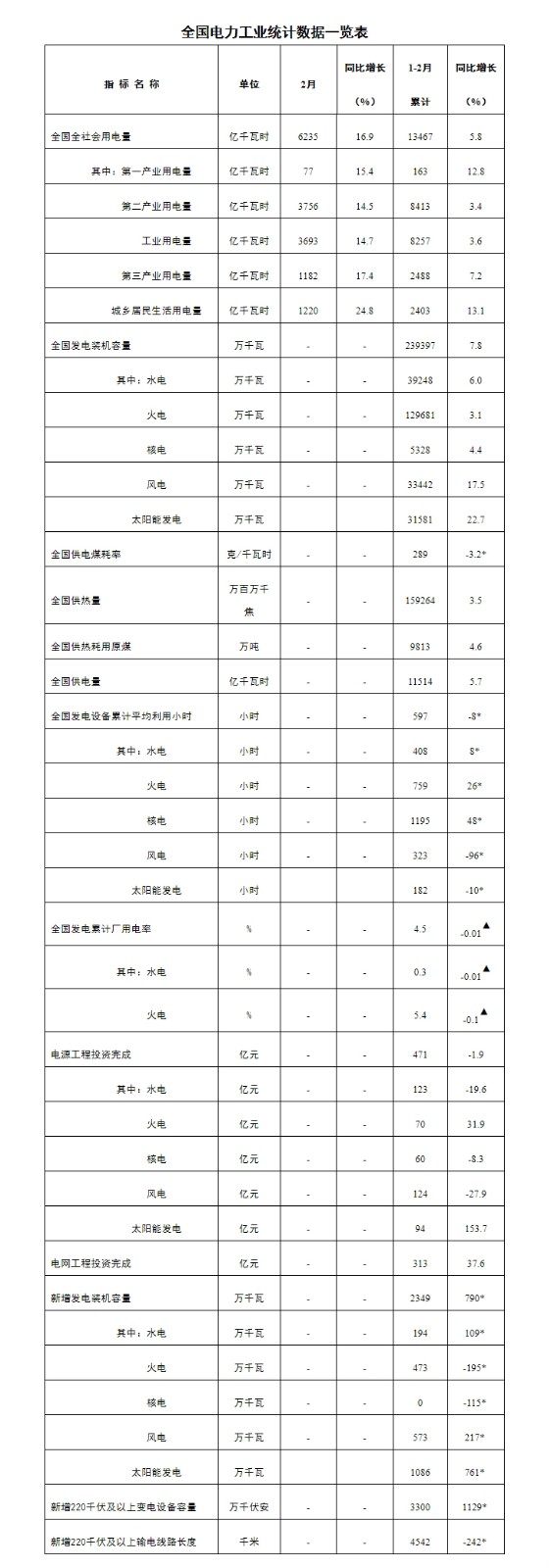注:1.全社會用電量為全口徑數據,全國供電量為調度口徑數據。2.“同比增長”列中,標*的指標為絕對量;標▲的指標為百分點。