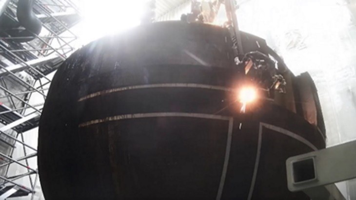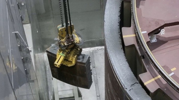隨后,在安裝分割和包裝設備并與客戶、獨立專家和當局一起成功進行所有必要的測試后,RPV - 質量為 235 噸,高度為 8.3 米,直徑為 5 米- 從其安裝位置移開并提升到通風的外殼中。在外殼內部,法蘭環通過熱切割與 RPV 的其余部分分離,并被運送到配備線鋸的分割區域。在線鋸的同時,法蘭環(在分段區域的壁厚高達 473 毫米)和 RPV(壁厚高達 216 毫米)在通風外殼內被熱切割成段。總共,RPV 被切割成 102 段,每段的質量高達 8.2 噸。