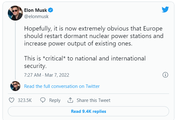 馬斯克的評論是指德國在2011 年 3 月福島核災(zāi)難后決定逐步淘汰核能。本月早些時(shí)候,他在推特上呼吁歐洲增加核能,因?yàn)楫?dāng)前國際局勢凸顯了德國對俄羅斯石油的依賴。