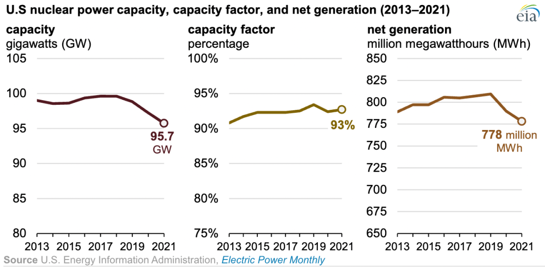 盡管可再生能源和天然氣發電廠的產量一直在上升,但美國核電廠仍在以高且穩定的利用率運行。自2012年以來,美國核電機組每年的平均容量因子至少達到90%,2021年核電廠因子為93%。