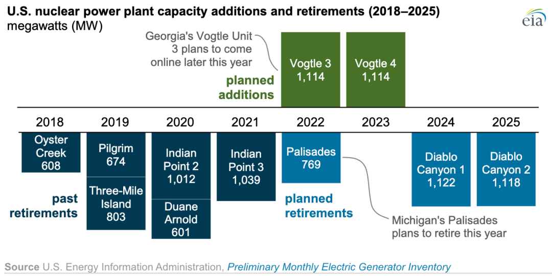 自2017年底以來,美國已經有6臺總容量為4736兆瓦的核發電機組退役。另外3臺總容量為3009兆瓦的機組計劃在未來幾年退役:密歇根州的Palisades核電站的一臺機組計劃在今年晚些時候退役,加利福尼亞州的Diablo Canyon核電站計劃在2024年和2025年分別退役一臺機組。