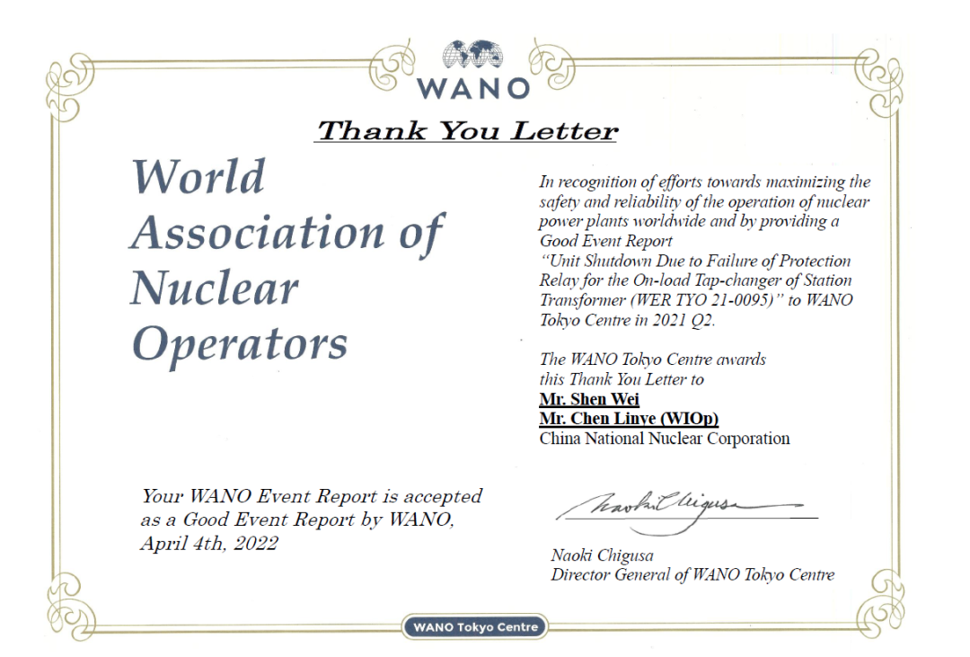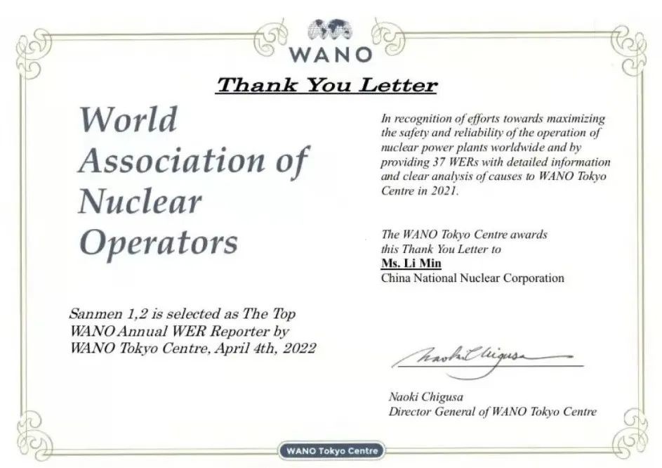 2021年,中國核電6篇WER (秦山核電2篇、福清核電2篇、海南核電1篇、三門核電1篇)被評為WANO東京中心“年度優秀報告”,中核武漢 作為中國核電WER報送支持單位,獲得WANO東京中心對于WER工作支持的感謝信。三門核電 獲得WANO東京中心“2021年度最佳報告電廠”榮譽,自2020年以來,三門核電已連續兩年獲此榮譽。另外,WANO莫斯科中心對江蘇核電 授予了“卓越管理獎”榮譽,對江蘇核電2021年WANO支持工作給予充分肯定。