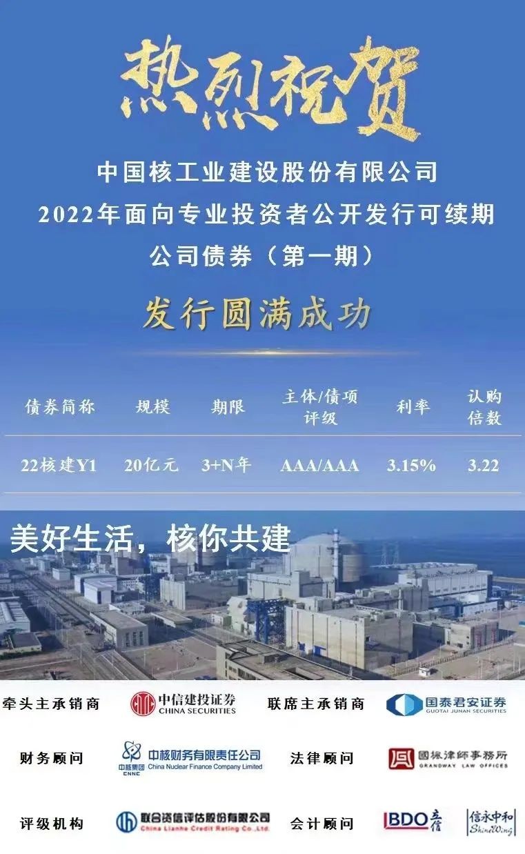 4月19日,中國核建成功發(fā)行2022年第一期可續(xù)期公司債券。本次發(fā)行募集資金20億元,期限3+N年,發(fā)行利率為3.15%,資金用途主要用于置換高息貸款。