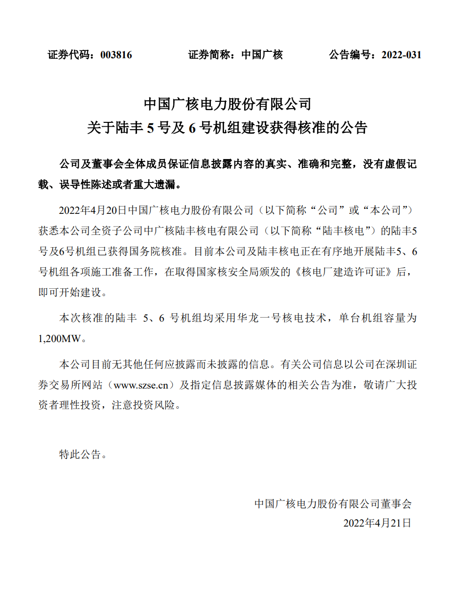 2022年4月20日中國(guó)廣核電力股份有限公司獲悉本公司全資子公司中廣核陸豐核電有限公司的陸豐5號(hào)及6號(hào)機(jī)組已獲得圍務(wù)院核準(zhǔn)。目前本公司及陸豐核電正在有序地開展陸豐5、6號(hào)機(jī)組各項(xiàng)施工準(zhǔn)備工作,在取得國(guó)家核安全局頒發(fā)的《核電廠建造許可證》后,即可開始建設(shè)。